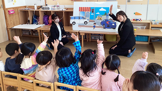 SDGs活動の一つとして子供たちを対象に交通安全普及活動に従業員が取り組んでいます。交通場面のイラストとキャラクターを使い、道路の正しい歩き方を子どもたちに示してもらうなど、参加しながら楽しく学べる内容の教材です。