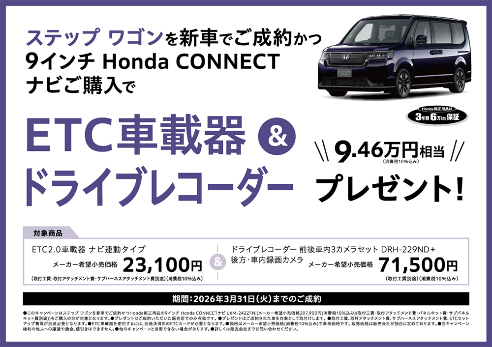 中段:<左>ステップ ワゴン e:HEV AIR EX 車両本体価格(消費税10%込み)3,938,000円★ 価格には写真の有料色及びディーラーオプションの価格は含まれておりません。 ボディーカラーはフィヨルドミスト・パール(有料色:38,500円高) ディーラーオプション(11.4インチ Honda CONNECTナビ LXM-247VFLi〈取付アタッチメント、パネルキット含む〉:320,100円〈取付工賃別途〉)装着車